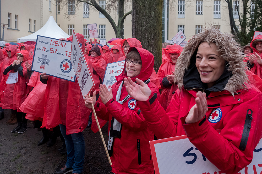 Grandiose Stimmung trotz Dauerregen: Rund 500 Rotkreuzschwestern aus der ganzen Republik sind am 23. Februar nach Berlin gekommen, um den erzielten Teilerfolg bezüglich AÜG auf dem Gelände des DRK-Generalsekretariats zu feiern.
